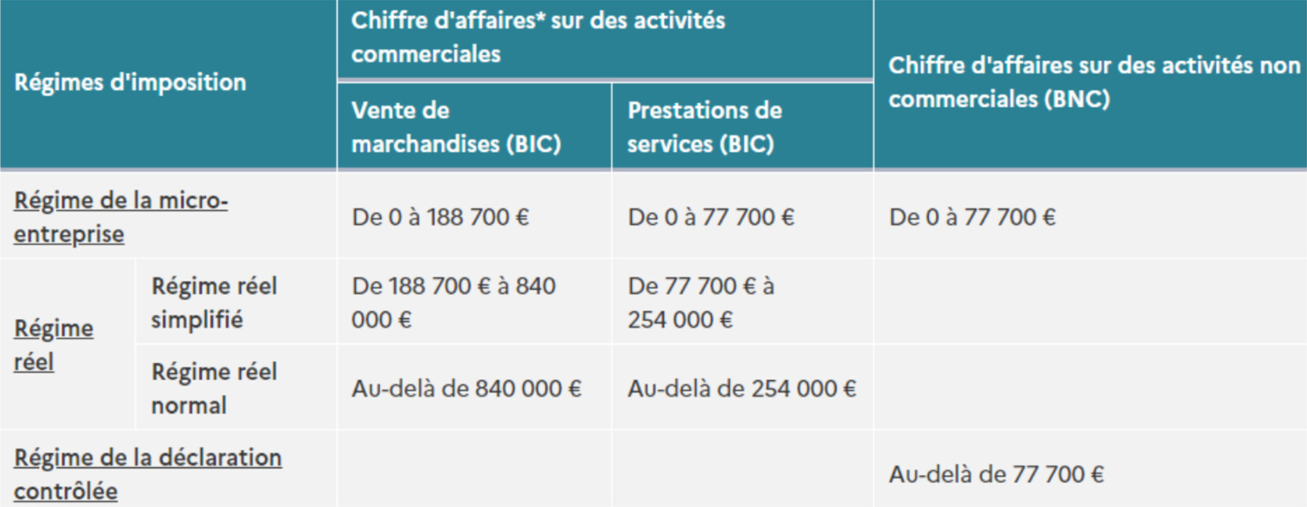 • 188 700 € pour les activités de ventes de marchandises : achat-revente, fourniture de logement, vente à consommer sur place (relevant des BIC) ;